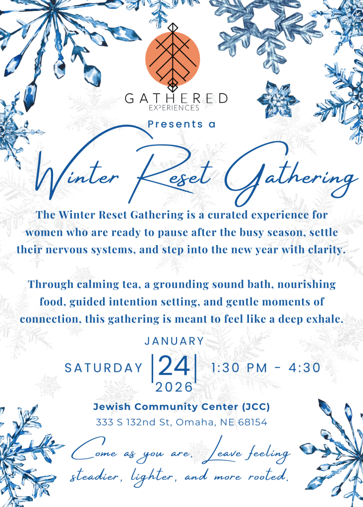 The gathering will take place at the Jewish Community Center (JCC) in Omaha (333 S 132nd St, Omaha, NE 68154). Guests will check in at the Goldstein room at 1:15. The sound bath will take place across the hall in the Wiesman Room.